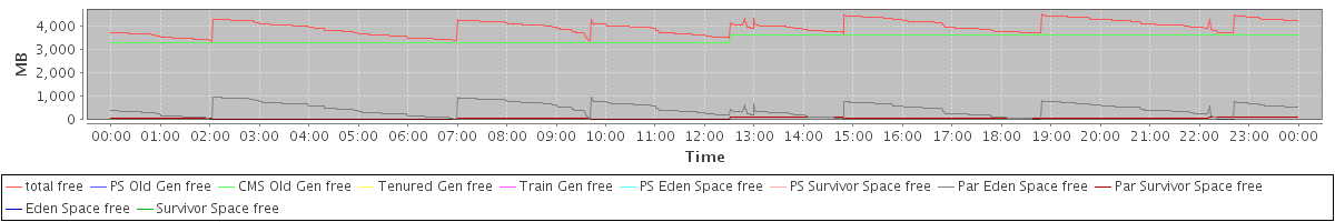 avg(total free) = 3972.23 avg(PS Old Gen free) = 0.00 avg(CMS Old Gen free) = 3456.35 avg(Tenured Gen free) = 0.00 avg(Train Gen free) = 0.00 avg(PS Eden Space free) = 0.00 avg(PS Survivor Space free) = 0.00 avg(Par Eden Space free) = 457.34 avg(Par Survivor Space free) = 58.54 avg(Eden Space free) = 0.00 avg(Survivor Space free) = 0.00