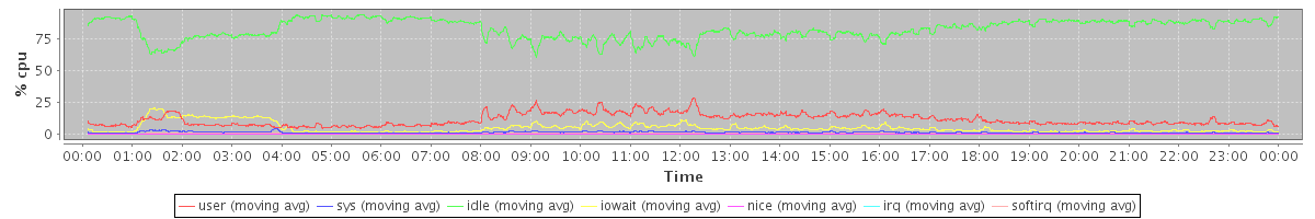 avg(user) = 11.30 avg(sys) = 1.18 avg(idle) = 82.38 avg(iowait) = 4.72 avg(nice) = 0.00 avg(irq) = 0.03 avg(softirq) = 0.38