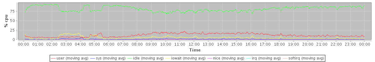 avg(user) = 11.70 avg(sys) = 1.28 avg(idle) = 81.56 avg(iowait) = 5.00 avg(nice) = 0.00 avg(irq) = 0.04 avg(softirq) = 0.43