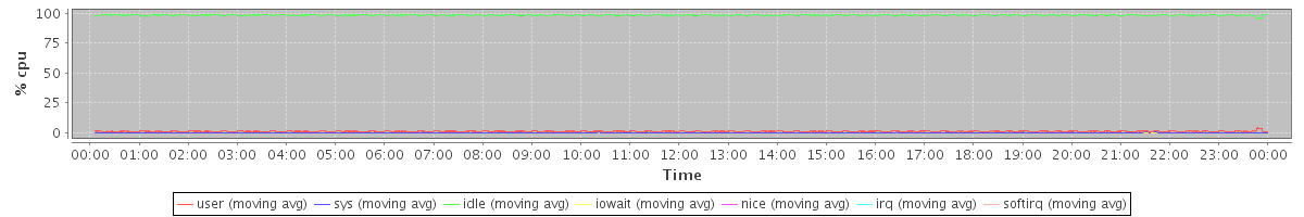 avg(user) = 1.14 avg(sys) = 0.16 avg(idle) = 98.63 avg(iowait) = 0.05 avg(nice) = 0.00 avg(irq) = 0.00 avg(softirq) = 0.00