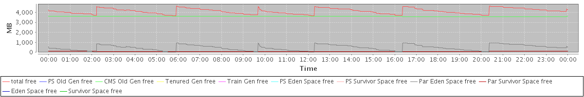 avg(total free) = 4114.13 avg(PS Old Gen free) = 0.00 avg(CMS Old Gen free) = 3588.84 avg(Tenured Gen free) = 0.00 avg(Train Gen free) = 0.00 avg(PS Eden Space free) = 0.00 avg(PS Survivor Space free) = 0.00 avg(Par Eden Space free) = 450.78 avg(Par Survivor Space free) = 74.51 avg(Eden Space free) = 0.00 avg(Survivor Space free) = 0.00