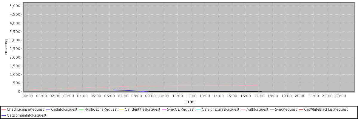 avg(CheckLicenseRequest) = 5.00 avg(GetInfoRequest) = 49.00 avg(FlushCacheRequest) = 53.00 avg(GetIdentitiesRequest) = 44.00 avg(SyncGalRequest) = 4959.00 avg(GetSignaturesRequest) = 1.00 avg(AuthRequest) = 272.00 avg(SyncRequest) = 1.50 avg(GetWhiteBlackListRequest) = 0.00 avg(GetDomainInfoRequest) = 11.67