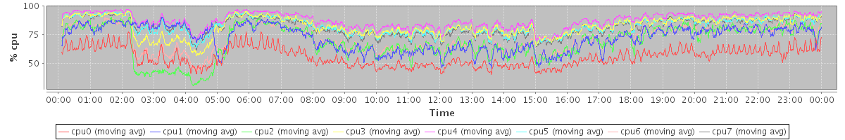 avg(cpu0) = 4.87 avg(cpu1) = 11.43 avg(cpu2) = 14.40 avg(cpu3) = 3.93 avg(cpu4) = 2.22 avg(cpu5) = 3.09 avg(cpu6) = 11.46 avg(cpu7) = 2.93