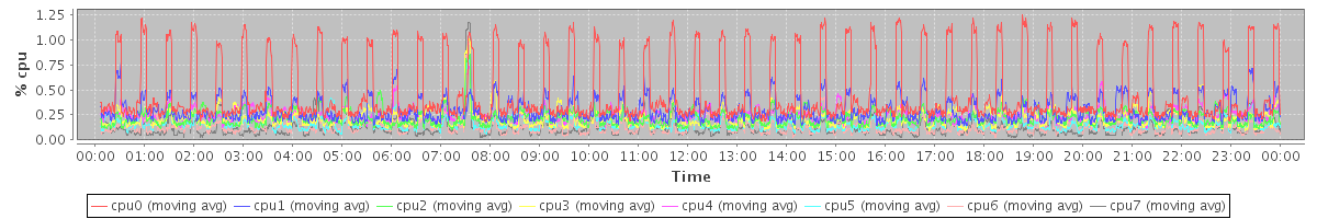 avg(cpu0) = 0.47 avg(cpu1) = 0.30 avg(cpu2) = 0.22 avg(cpu3) = 0.21 avg(cpu4) = 0.24 avg(cpu5) = 0.16 avg(cpu6) = 0.13 avg(cpu7) = 0.12