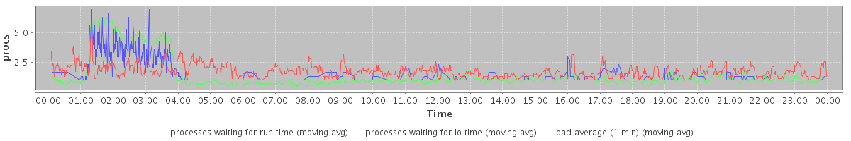 avg(processes waiting for run time) = 0.95 avg(processes waiting for io time) = 0.52 avg(load average (1 min)) = 1.39