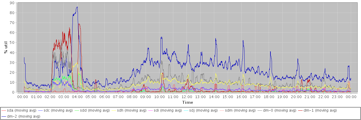 avg(sda) = 0.77 avg(sdc) = 2.58 avg(sdd) = 1.41 avg(sdh) = 7.47 avg(sdi) = 2.56 avg(sdj) = 1.40 avg(sdm) = 0.00 avg(dm-0) = 9.75 avg(dm-1) = 5.06 avg(dm-2) = 21.81