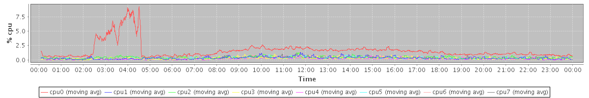 avg(cpu0) = 1.65 avg(cpu1) = 0.33 avg(cpu2) = 0.41 avg(cpu3) = 0.26 avg(cpu4) = 0.17 avg(cpu5) = 0.23 avg(cpu6) = 0.28 avg(cpu7) = 0.25