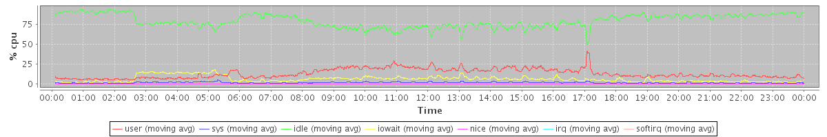 avg(user) = 12.89 avg(sys) = 1.42 avg(idle) = 79.32 avg(iowait) = 5.85 avg(nice) = 0.00 avg(irq) = 0.05 avg(softirq) = 0.47
