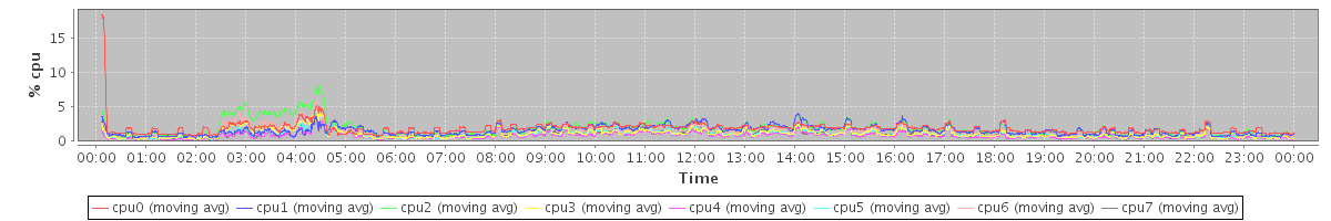 avg(cpu0) = 1.61 avg(cpu1) = 0.34 avg(cpu2) = 0.42 avg(cpu3) = 0.25 avg(cpu4) = 0.19 avg(cpu5) = 0.25 avg(cpu6) = 0.28 avg(cpu7) = 0.22