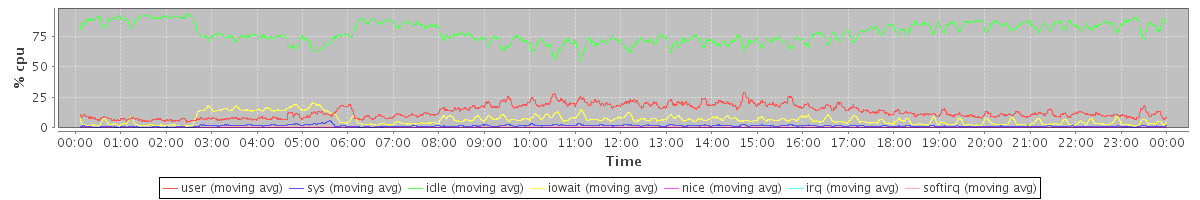 avg(user) = 13.41 avg(sys) = 1.48 avg(idle) = 77.91 avg(iowait) = 6.64 avg(nice) = 0.00 avg(irq) = 0.06 avg(softirq) = 0.51