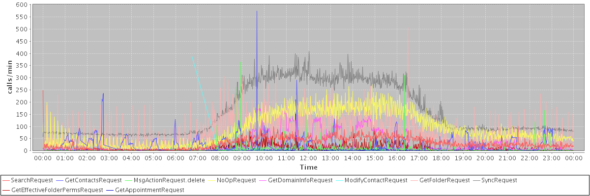 max(SearchRequest) = 249.00 max(GetContactsRequest) = 575.00 max(MsgActionRequest.delete) = 365.00 max(NoOpRequest) = 272.00 max(GetDomainInfoRequest) = 177.00 max(ModifyContactRequest) = 387.00 max(GetFolderRequest) = 508.00 max(SyncRequest) = 410.00 max(GetEffectiveFolderPermsRequest) = 159.00 max(GetAppointmentRequest) = 210.00