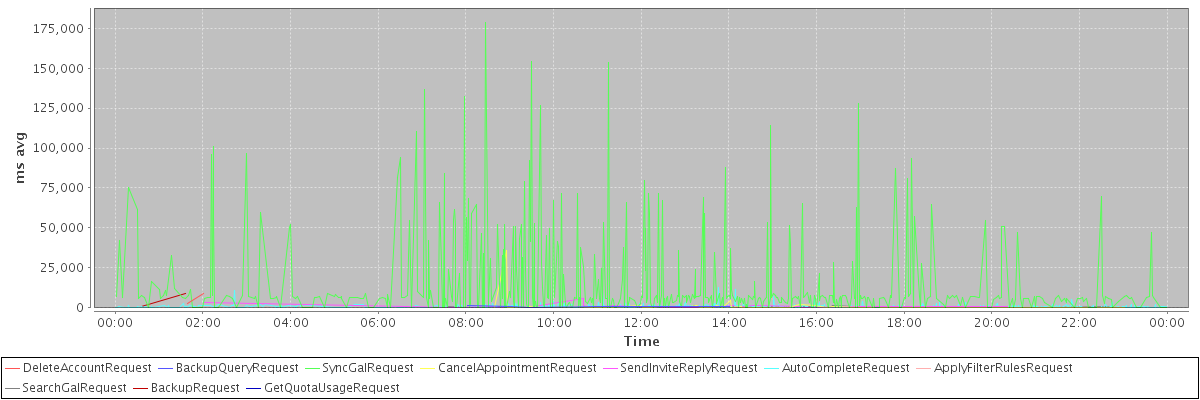 avg(DeleteAccountRequest) = 5734.00 avg(BackupQueryRequest) = 797.20 avg(SyncGalRequest) = 14747.88 avg(CancelAppointmentRequest) = 1147.55 avg(SendInviteReplyRequest) = 836.50 avg(AutoCompleteRequest) = 739.76 avg(ApplyFilterRulesRequest) = 6219.00 avg(SearchGalRequest) = 631.98 avg(BackupRequest) = 4958.00 avg(GetQuotaUsageRequest) = 1084.00