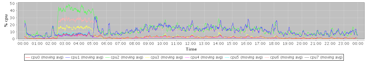 avg(cpu0) = 1.67 avg(cpu1) = 0.32 avg(cpu2) = 0.41 avg(cpu3) = 0.24 avg(cpu4) = 0.16 avg(cpu5) = 0.21 avg(cpu6) = 0.28 avg(cpu7) = 0.24