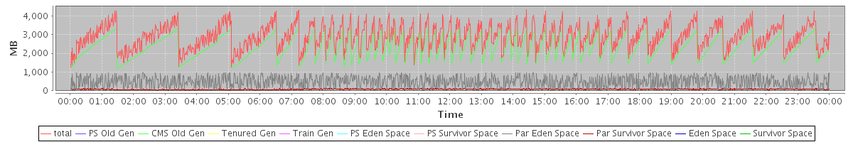 avg(total) = 2902.12 avg(PS Old Gen) = 0.00 avg(CMS Old Gen) = 2335.95 avg(Tenured Gen) = 0.00 avg(Train Gen) = 0.00 avg(PS Eden Space) = 0.00 avg(PS Survivor Space) = 0.00 avg(Par Eden Space) = 488.10 avg(Par Survivor Space) = 78.07 avg(Eden Space) = 0.00 avg(Survivor Space) = 0.00