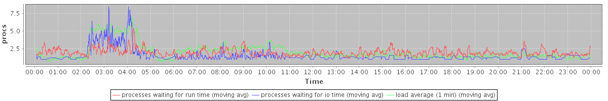 avg(processes waiting for run time) = 1.39 avg(processes waiting for io time) = 0.78 avg(load average (1 min)) = 2.07