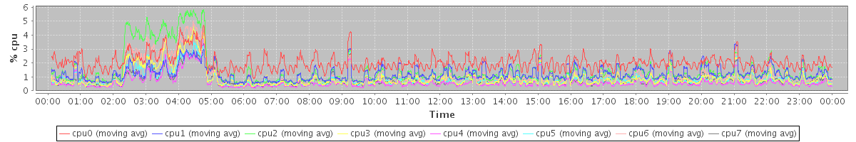 avg(cpu0) = 2.42 avg(cpu1) = 0.31 avg(cpu2) = 0.43 avg(cpu3) = 0.25 avg(cpu4) = 0.15 avg(cpu5) = 0.23 avg(cpu6) = 0.27 avg(cpu7) = 0.24