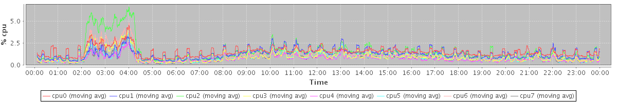 avg(cpu0) = 1.53 avg(cpu1) = 0.25 avg(cpu2) = 0.33 avg(cpu3) = 0.18 avg(cpu4) = 0.15 avg(cpu5) = 0.14 avg(cpu6) = 0.20 avg(cpu7) = 0.16