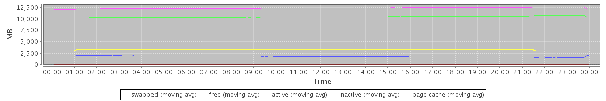 avg(swapped) = 0.16 avg(free) = 1818.75 avg(active) = 10433.60 avg(inactive) = 3202.00 avg(page cache) = 12389.12