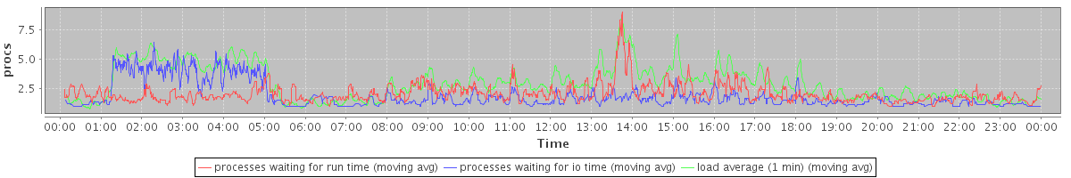 avg(processes waiting for run time) = 1.48 avg(processes waiting for io time) = 1.24 avg(load average (1 min)) = 2.98