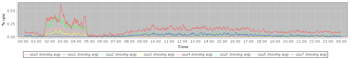 avg(cpu0) = 1.37 avg(cpu1) = 0.34 avg(cpu2) = 0.43 avg(cpu3) = 0.32 avg(cpu4) = 0.22 avg(cpu5) = 0.25 avg(cpu6) = 0.29 avg(cpu7) = 0.25