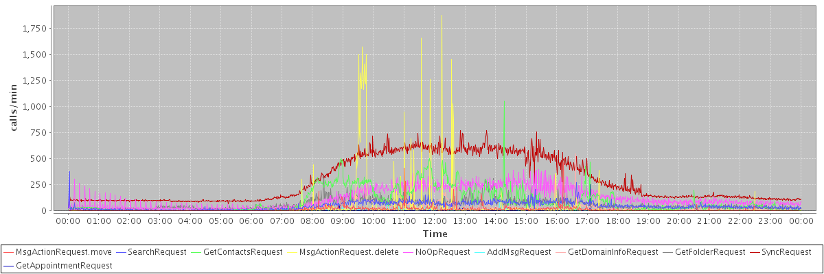 max(MsgActionRequest.move) = 459.00 max(SearchRequest) = 375.00 max(GetContactsRequest) = 1049.00 max(MsgActionRequest.delete) = 1874.00 max(NoOpRequest) = 398.00 max(AddMsgRequest) = 274.00 max(GetDomainInfoRequest) = 547.00 max(GetFolderRequest) = 344.00 max(SyncRequest) = 772.00 max(GetAppointmentRequest) = 250.00