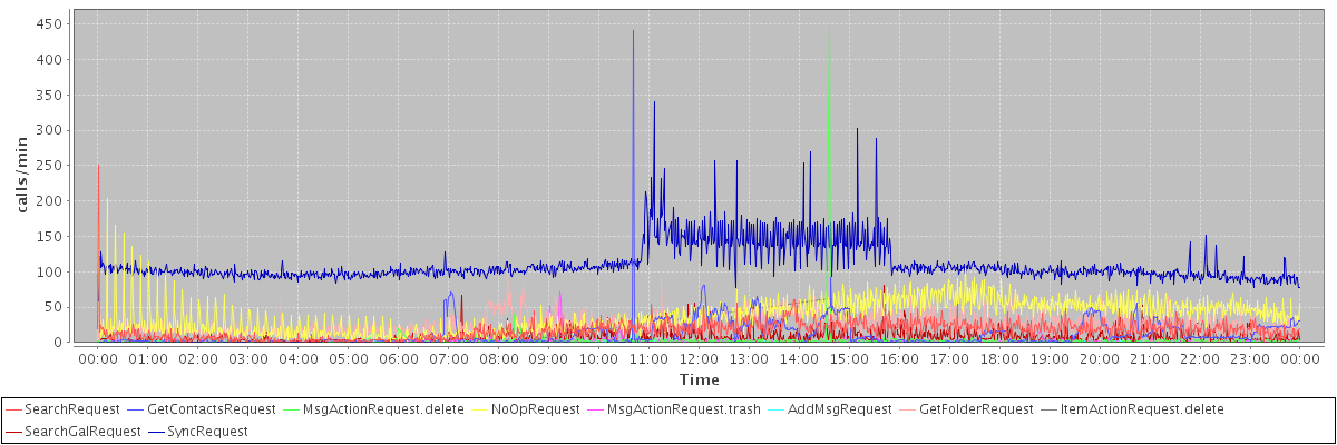 max(SearchRequest) = 251.00 max(GetContactsRequest) = 440.00 max(MsgActionRequest.delete) = 449.00 max(NoOpRequest) = 204.00 max(MsgActionRequest.trash) = 71.00 max(AddMsgRequest) = 53.00 max(GetFolderRequest) = 104.00 max(ItemActionRequest.delete) = 62.00 max(SearchGalRequest) = 81.00 max(SyncRequest) = 340.00