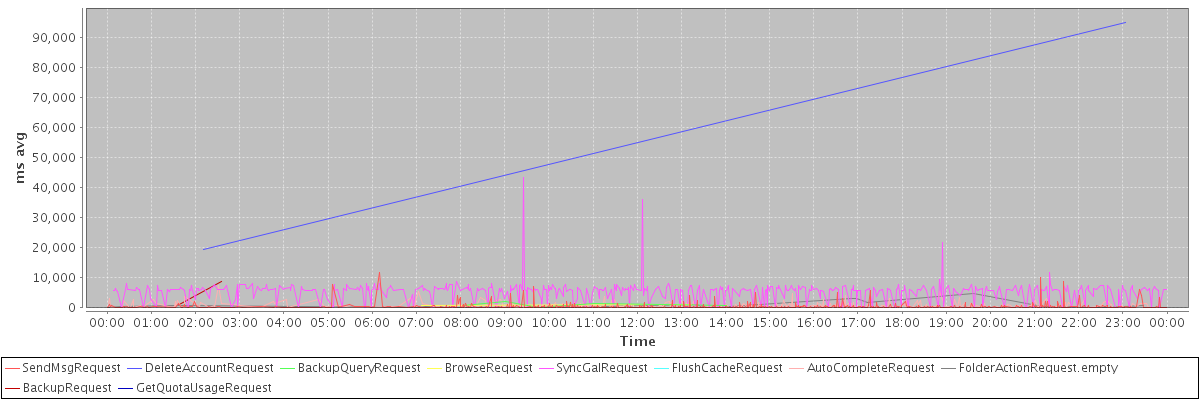avg(SendMsgRequest) = 471.73 avg(DeleteAccountRequest) = 57329.00 avg(BackupQueryRequest) = 975.80 avg(BrowseRequest) = 969.50 avg(SyncGalRequest) = 5348.31 avg(FlushCacheRequest) = 402.00 avg(AutoCompleteRequest) = 721.47 avg(FolderActionRequest.empty) = 868.48 avg(BackupRequest) = 4837.00 avg(GetQuotaUsageRequest) = 3267.00