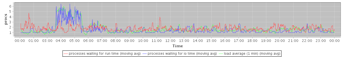 avg(processes waiting for run time) = 1.06 avg(processes waiting for io time) = 0.69 avg(load average (1 min)) = 1.74