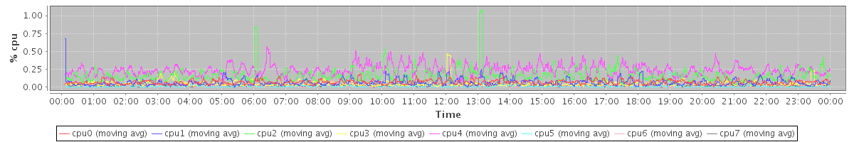 avg(cpu0) = 0.54 avg(cpu1) = 0.34 avg(cpu2) = 0.24 avg(cpu3) = 0.25 avg(cpu4) = 0.27 avg(cpu5) = 0.18 avg(cpu6) = 0.14 avg(cpu7) = 0.13