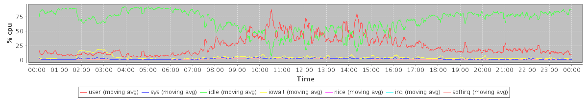 avg(user) = 24.40 avg(sys) = 1.92 avg(idle) = 68.40 avg(iowait) = 4.22 avg(nice) = 0.00 avg(irq) = 0.04 avg(softirq) = 1.01