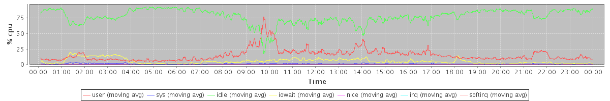 avg(user) = 15.12 avg(sys) = 1.14 avg(idle) = 77.85 avg(iowait) = 5.41 avg(nice) = 0.00 avg(irq) = 0.03 avg(softirq) = 0.44