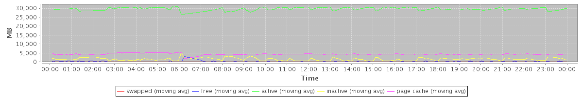 avg(swapped) = 0.25 avg(free) = 255.92 avg(active) = 29559.69 avg(inactive) = 1518.78 avg(page cache) = 4386.99
