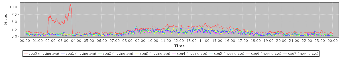 avg(cpu0) = 2.32 avg(cpu1) = 1.08 avg(cpu2) = 1.05 avg(cpu3) = 1.01 avg(cpu4) = 0.84 avg(cpu5) = 0.96 avg(cpu6) = 0.98 avg(cpu7) = 0.99