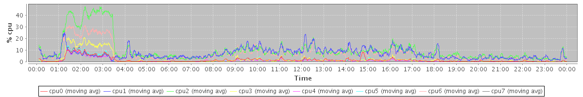 avg(cpu0) = 1.59 avg(cpu1) = 1.16 avg(cpu2) = 1.44 avg(cpu3) = 0.89 avg(cpu4) = 0.68 avg(cpu5) = 0.81 avg(cpu6) = 1.05 avg(cpu7) = 0.77