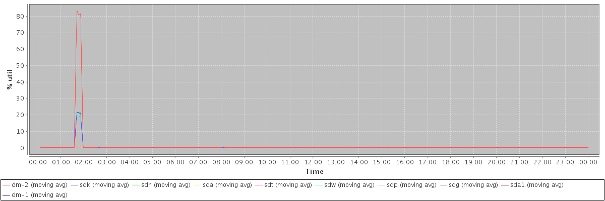 avg(dm-2) = 1.10 avg(sdk) = 0.29 avg(sdh) = 0.27 avg(sda) = 0.04 avg(sdt) = 0.26 avg(sdw) = 0.28 avg(sdp) = 0.01 avg(sdg) = 0.01 avg(sda1) = 0.04 avg(dm-1) = 0.02