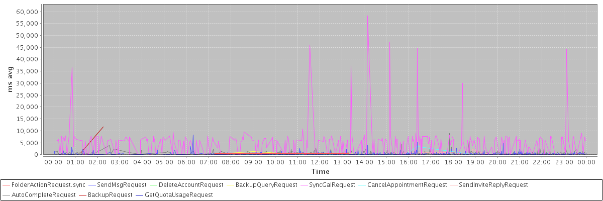 avg(FolderActionRequest.sync) = 421.50 avg(SendMsgRequest) = 315.97 avg(DeleteAccountRequest) = 60170.00 avg(BackupQueryRequest) = 609.60 avg(SyncGalRequest) = 4731.85 avg(CancelAppointmentRequest) = 392.33 avg(SendInviteReplyRequest) = 560.50 avg(AutoCompleteRequest) = 526.02 avg(BackupRequest) = 6269.00 avg(GetQuotaUsageRequest) = 4600.00