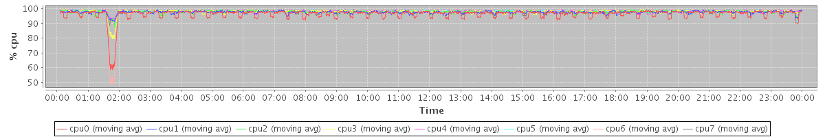 avg(cpu0) = 96.25 avg(cpu1) = 97.54 avg(cpu2) = 97.73 avg(cpu3) = 98.00 avg(cpu4) = 98.09 avg(cpu5) = 98.19 avg(cpu6) = 97.90 avg(cpu7) = 98.05