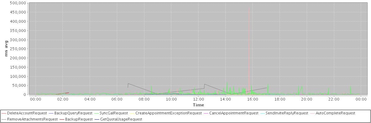 avg(DeleteAccountRequest) = 11823.00 avg(BackupQueryRequest) = 1762.33 avg(SyncGalRequest) = 6093.05 avg(CreateAppointmentExceptionRequest) = 658.78 avg(CancelAppointmentRequest) = 651.34 avg(SendInviteReplyRequest) = 766.05 avg(AutoCompleteRequest) = 1588.31 avg(RemoveAttachmentsRequest) = 24457.50 avg(BackupRequest) = 6296.50 avg(GetQuotaUsageRequest) = 3923.00