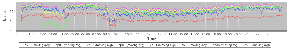 avg(cpu0) = 57.08 avg(cpu1) = 74.54 avg(cpu2) = 73.55 avg(cpu3) = 81.83 avg(cpu4) = 85.99 avg(cpu5) = 82.33 avg(cpu6) = 74.28 avg(cpu7) = 80.26