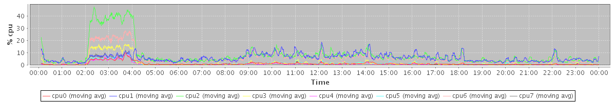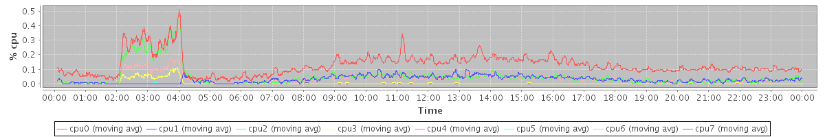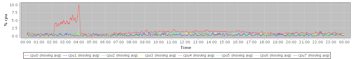 avg(cpu0) = 1.37 avg(cpu1) = 0.35 avg(cpu2) = 0.40 avg(cpu3) = 0.28 avg(cpu4) = 0.17 avg(cpu5) = 0.23 avg(cpu6) = 0.26 avg(cpu7) = 0.24