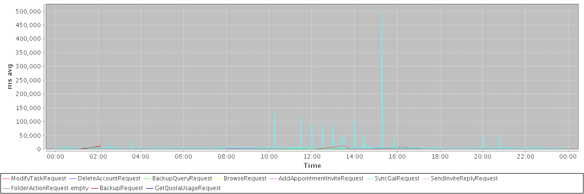 avg(ModifyTaskRequest) = 2191.67 avg(DeleteAccountRequest) = 914.00 avg(BackupQueryRequest) = 723.80 avg(BrowseRequest) = 1568.00 avg(AddAppointmentInviteRequest) = 1417.50 avg(SyncGalRequest) = 5864.80 avg(SendInviteReplyRequest) = 595.23 avg(FolderActionRequest.empty) = 754.00 avg(BackupRequest) = 6086.50 avg(GetQuotaUsageRequest) = 1351.00