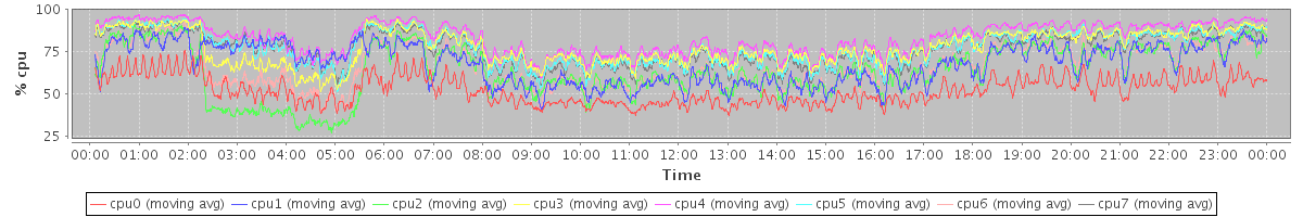 avg(cpu0) = 52.09 avg(cpu1) = 67.82 avg(cpu2) = 63.66 avg(cpu3) = 77.42 avg(cpu4) = 82.93 avg(cpu5) = 77.50 avg(cpu6) = 66.13 avg(cpu7) = 76.77