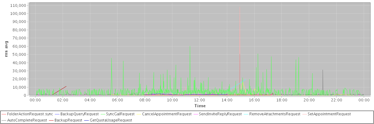 avg(FolderActionRequest.sync) = 1053.75 avg(BackupQueryRequest) = 993.00 avg(SyncGalRequest) = 4336.39 avg(CancelAppointmentRequest) = 613.73 avg(SendInviteReplyRequest) = 680.22 avg(RemoveAttachmentsRequest) = 5955.50 avg(SetAppointmentRequest) = 584.27 avg(AutoCompleteRequest) = 740.33 avg(BackupRequest) = 6031.50 avg(GetQuotaUsageRequest) = 4818.00
