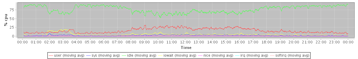 avg(user) = 15.72 avg(sys) = 1.86 avg(idle) = 77.03 avg(iowait) = 4.36 avg(nice) = 0.00 avg(irq) = 0.04 avg(softirq) = 0.98