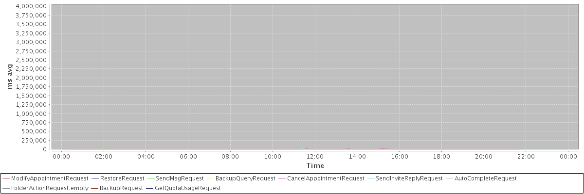 avg(ModifyAppointmentRequest) = 607.96 avg(RestoreRequest) = 3873479.00 avg(SendMsgRequest) = 482.22 avg(BackupQueryRequest) = 722.86 avg(CancelAppointmentRequest) = 1152.49 avg(SendInviteReplyRequest) = 1053.69 avg(AutoCompleteRequest) = 798.56 avg(FolderActionRequest.empty) = 620.06 avg(BackupRequest) = 4906.50 avg(GetQuotaUsageRequest) = 5331.00