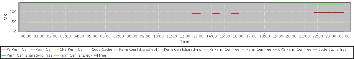 avg(PS Perm Gen) = 0.00 avg(Perm Gen) = 0.00 avg(CMS Perm Gen) = 138.36 avg(Code Cache) = 47.50 avg(Perm Gen [shared-ro]) = 0.00 avg(Perm Gen [shared-rw]) = 0.00 avg(PS Perm Gen free) = 0.00 avg(Perm Gen free) = 0.00 avg(CMS Perm Gen free) = 93.53 avg(Code Cache free) = 0.44 avg(Perm Gen [shared-ro] free) = 0.00 avg(Perm Gen [shared-rw] free) = 0.00