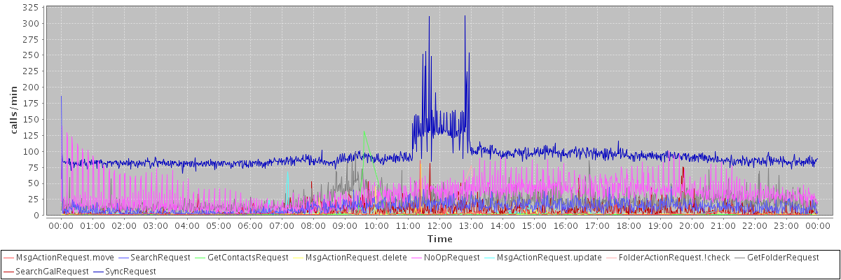 max(MsgActionRequest.move) = 86.00 max(SearchRequest) = 186.00 max(GetContactsRequest) = 131.00 max(MsgActionRequest.delete) = 80.00 max(NoOpRequest) = 139.00 max(MsgActionRequest.update) = 68.00 max(FolderActionRequest.!check) = 78.00 max(GetFolderRequest) = 99.00 max(SearchGalRequest) = 81.00 max(SyncRequest) = 312.00