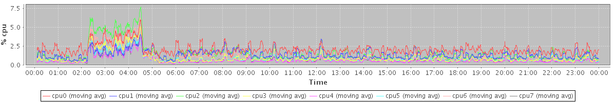 avg(cpu0) = 2.51 avg(cpu1) = 0.47 avg(cpu2) = 0.62 avg(cpu3) = 0.47 avg(cpu4) = 0.25 avg(cpu5) = 0.36 avg(cpu6) = 0.41 avg(cpu7) = 0.37