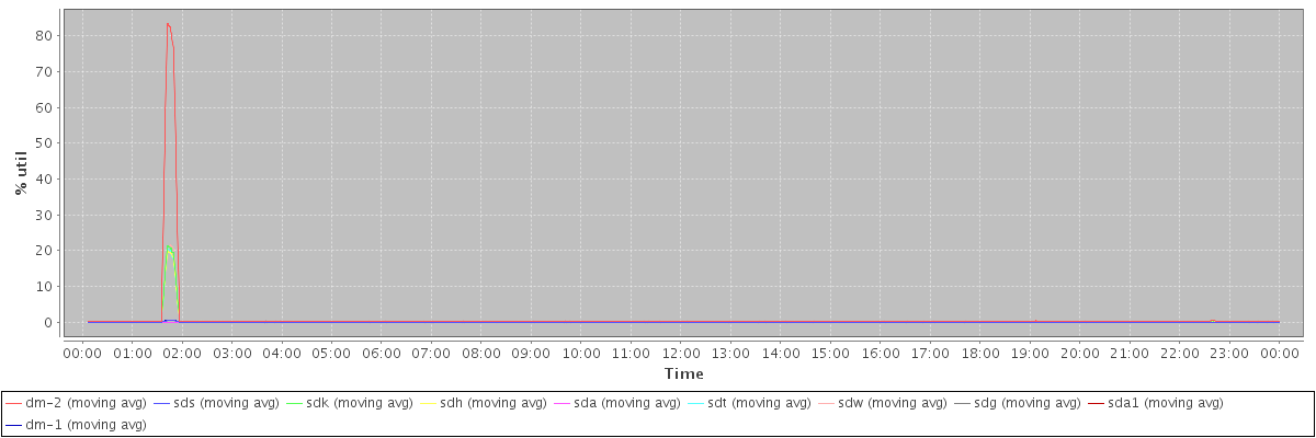 avg(dm-2) = 0.99 avg(sds) = 0.01 avg(sdk) = 0.25 avg(sdh) = 0.24 avg(sda) = 0.05 avg(sdt) = 0.24 avg(sdw) = 0.26 avg(sdg) = 0.01 avg(sda1) = 0.05 avg(dm-1) = 0.02