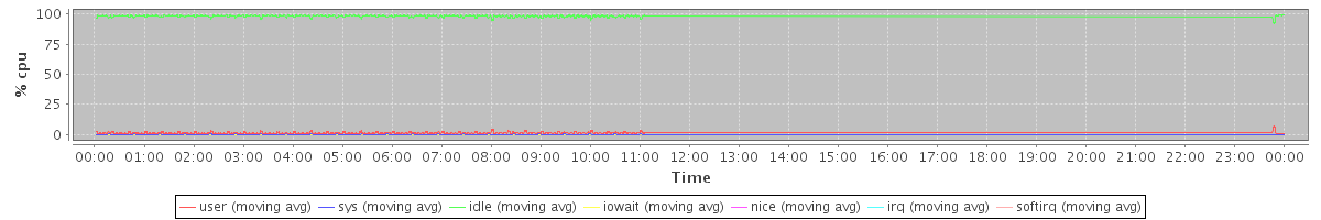 avg(user) = 1.27 avg(sys) = 0.17 avg(idle) = 98.48 avg(iowait) = 0.04 avg(nice) = 0.00 avg(irq) = 0.00 avg(softirq) = 0.00